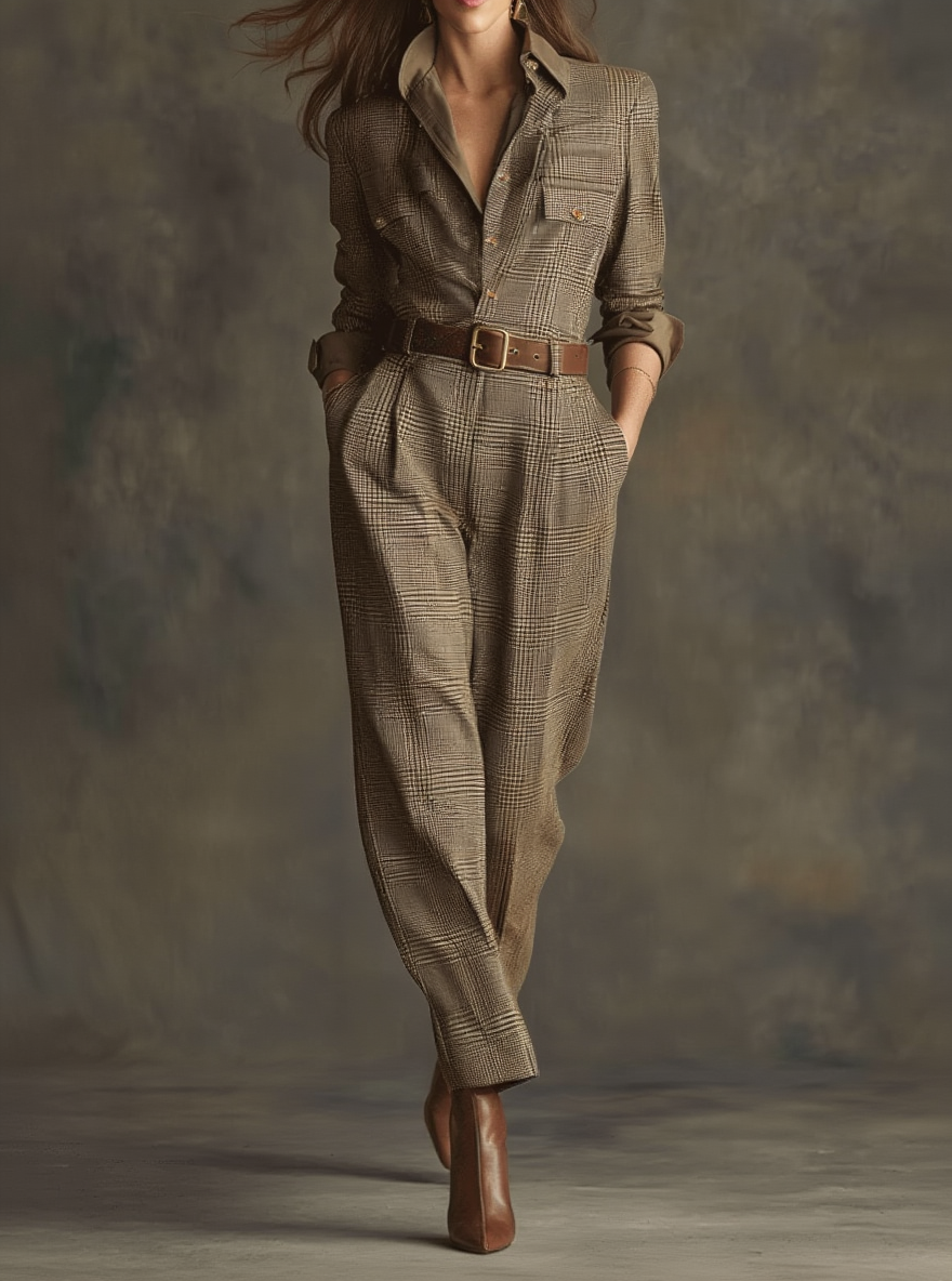 Barna overál kockás textúrával és dizájnnal, hasznos részletekkel és elegáns, praktikus megjelenéssel, ideális munkahelyre és stílusos mindennapi viseletre.